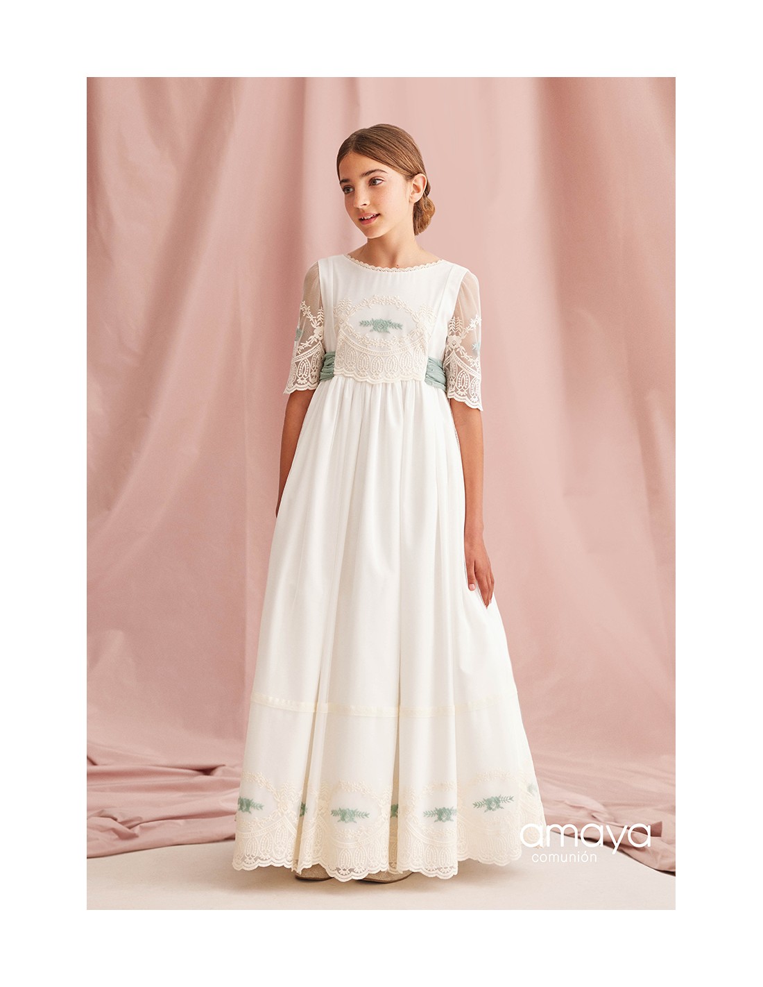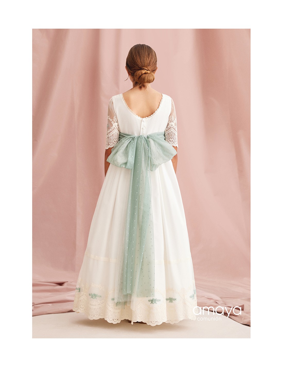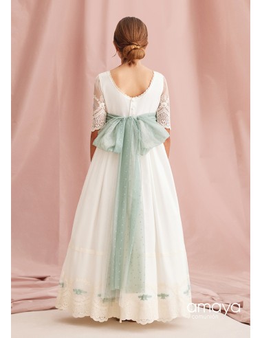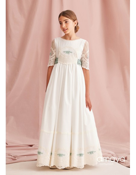 Traje de comunión de Amaya con lazada y motivos en verde