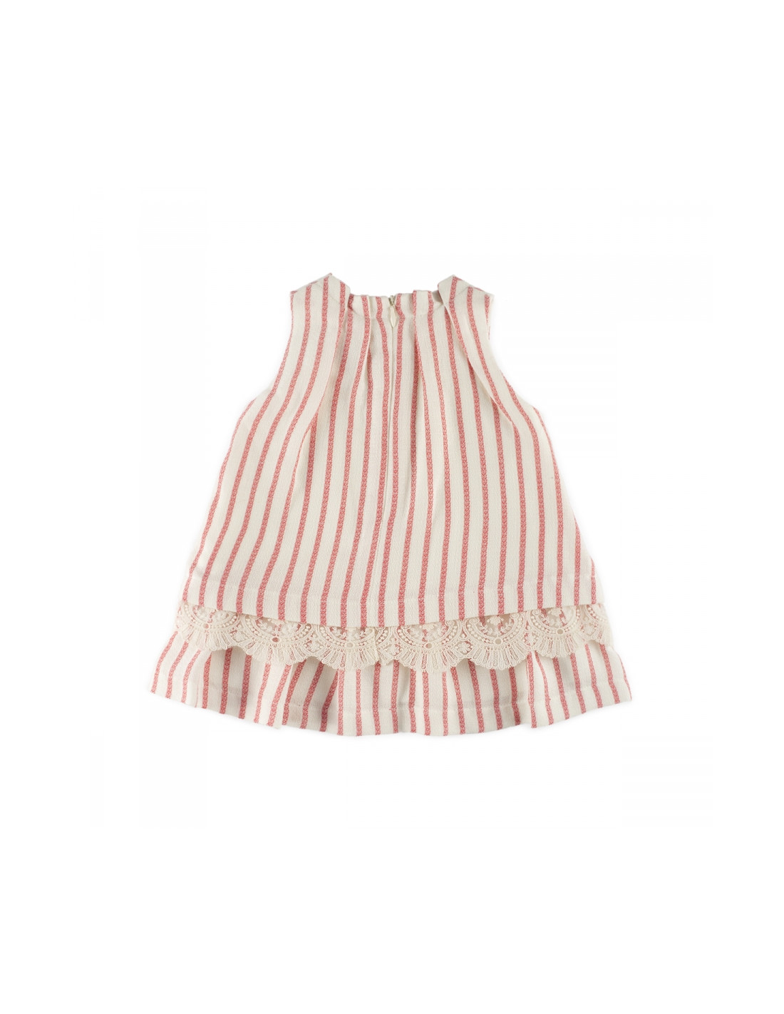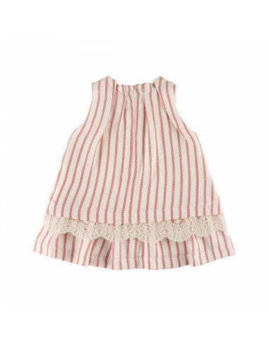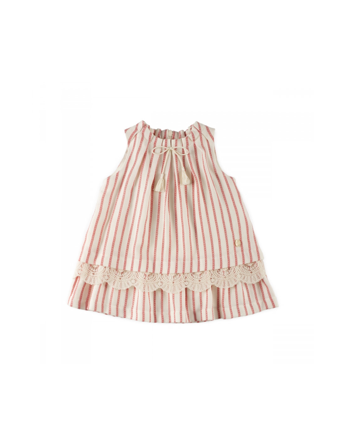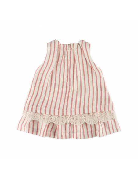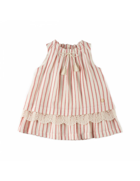 Vestido en lino estampado de rayas sin mangas, adornado con tul bordado en el bajo y lazo con borlas en el cuello. Cierre con cremallera en la espalda.