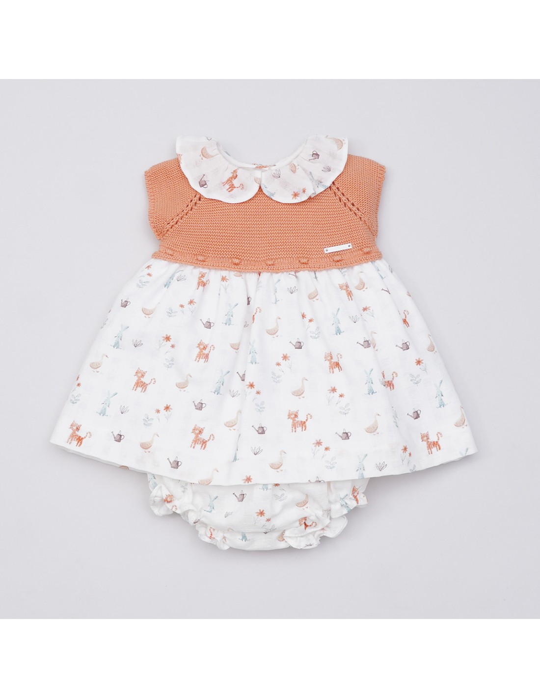 Vetido Pangasa con cuerpo punto anaranjado y falda estampada con tonos a juego
