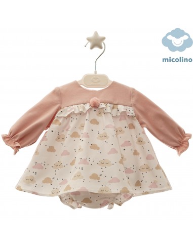 Jesusito Micolino con cuerpo de punto rosa y falda con estampado de nubes a tono