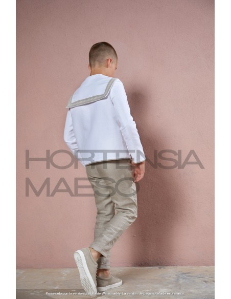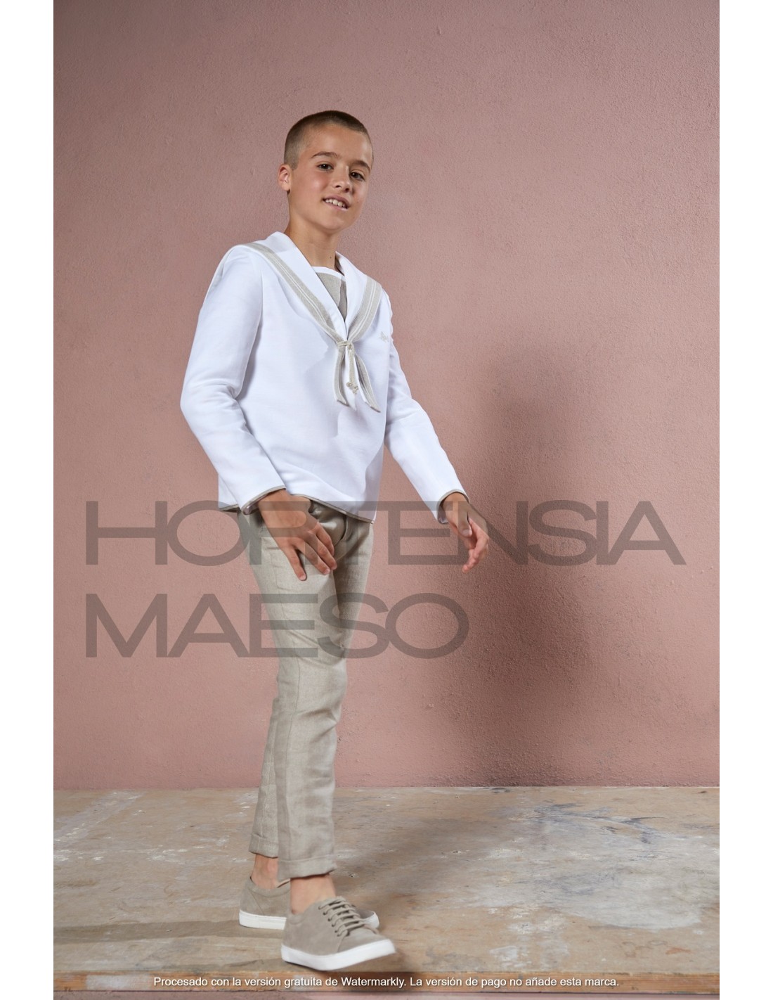 Marinero de Hortensia Maeso compuesto por casaca Aiden y Bermuda Edgar, combinando lino blanco y arena