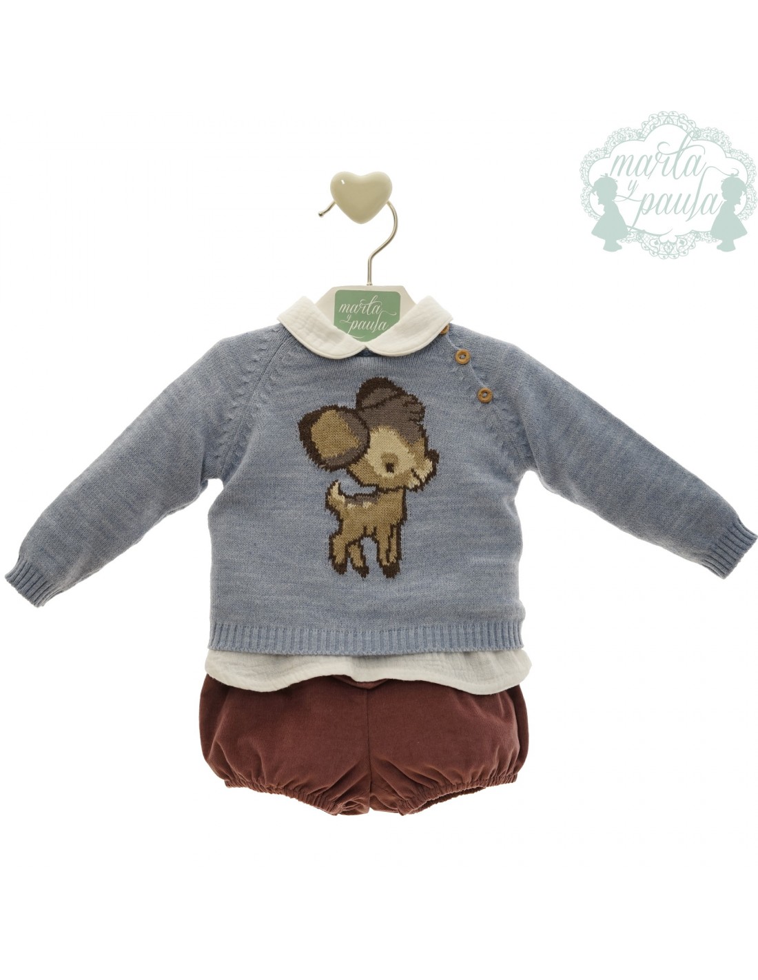 Conjunto Micolino de niño compuesto por bombacho morado con sueter de lana y camisa de bambula