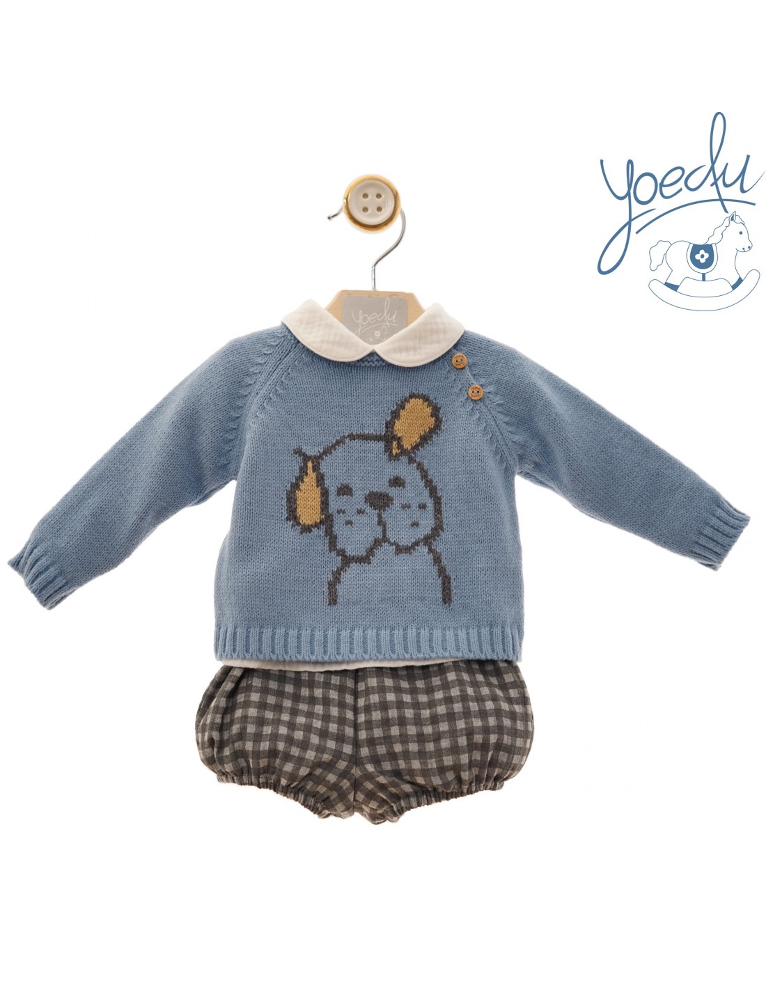 Conjunto Yoedu compuesto por jersey en celeste empolvado y bombacho a cuadros grises