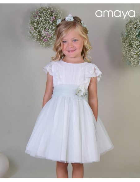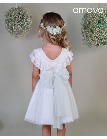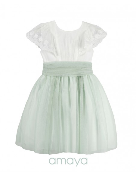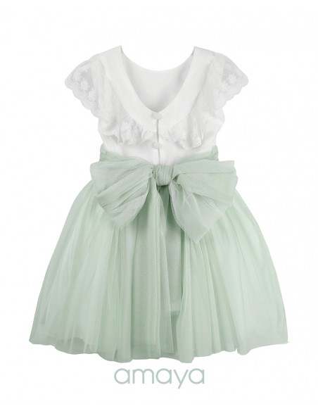 Vestido Amaya en tul con falda y lazada en verde y puntilla a lo largo del cuerpo por delante y detrás
