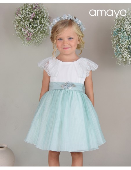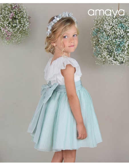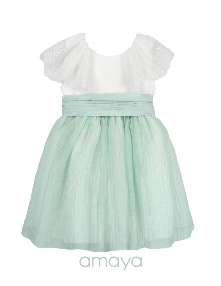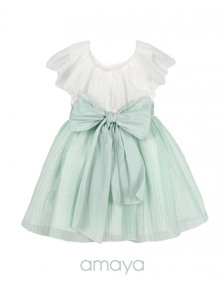 Vestido Amaya en tul verde con lazada a juego, cuerpo con puntillas