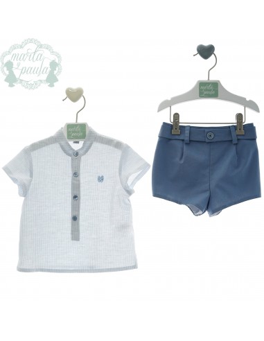 Conjunto de niño de Marta y Paula compuesto por pantalón corto en azul petróleo y blusa a rayas a tono con el pantalón