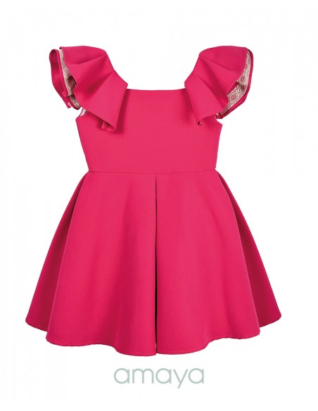Vestido Amaya fucsia con volantes en las mangas acabados en puntilla a juego con cinturón en parte trasera