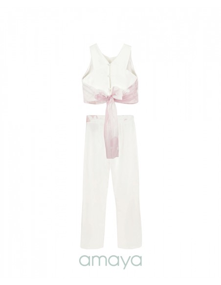 Conjunto Amaya compuesto por pantalón blanco roto y top combinado con estampados en tonos rosa pastel con lazada trasera