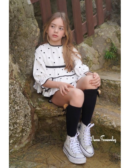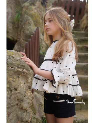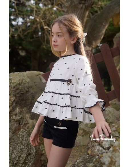 Conjunto de Noma Fernandez compuesto por blusón de volantes a lunares negros a tono con el short