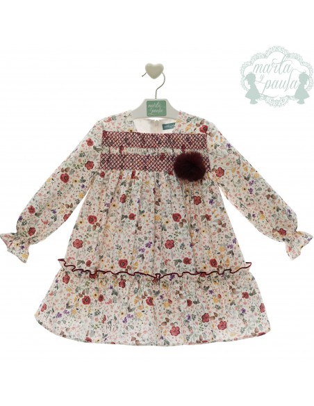 Vestido Marta y Paula con estampado floral, lazada de terciopelo rojo en parte trasera