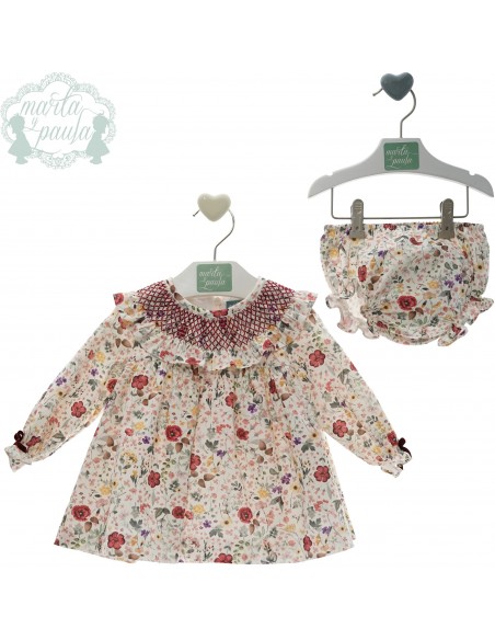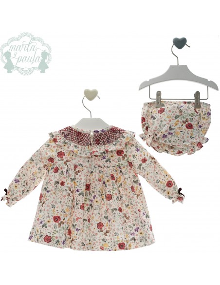 Vestido de bebé de Marta y Paula con estampado floral y nido de abeja en el cuello