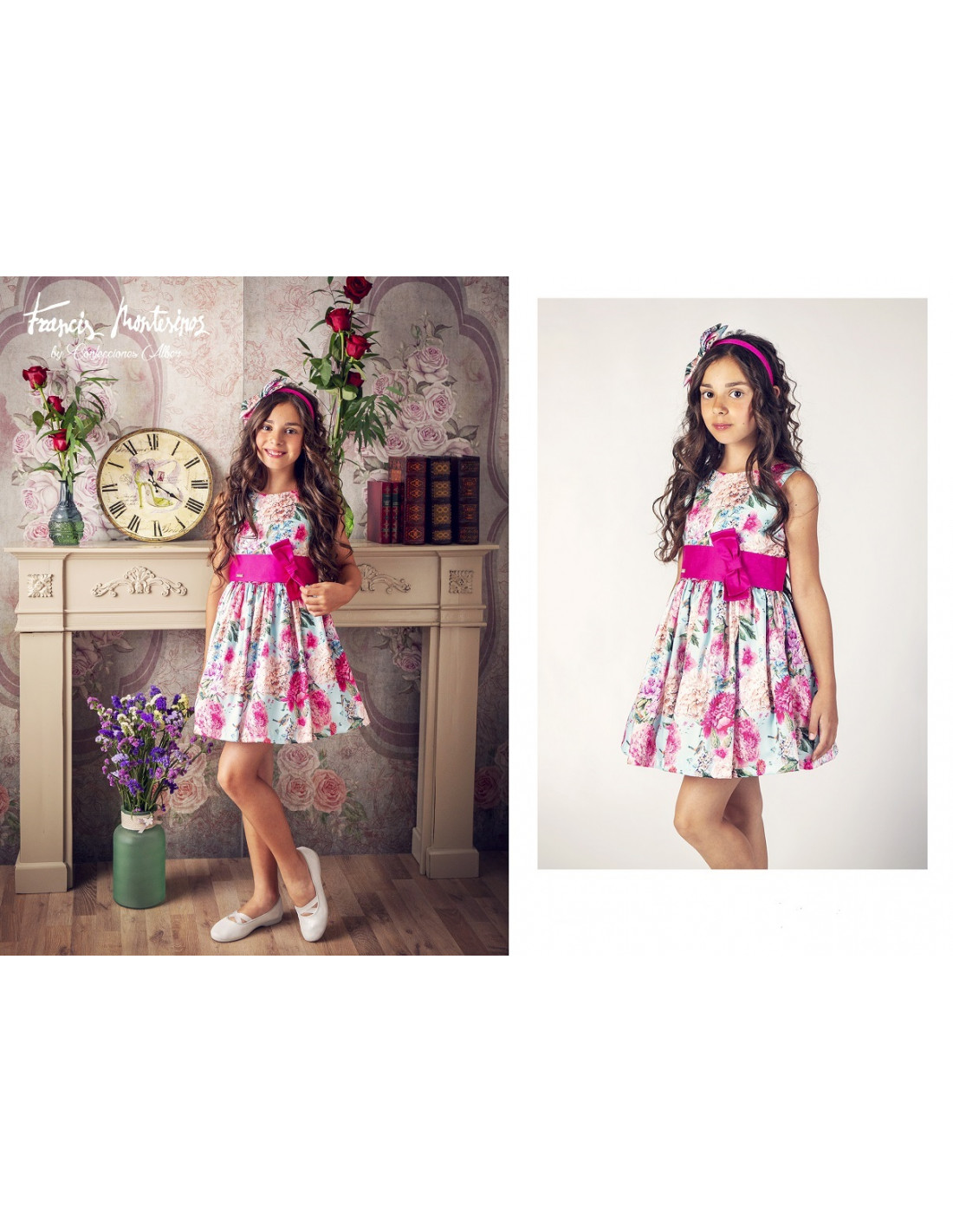 Vestido Francis Montesino estampado floral con fajin fucsia en la cintu