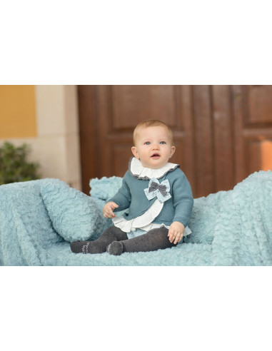 Jersey tricot combinado para niña en tonos verdosos, con un gran lazo en el pecho, volante en el cuello redondo y estilo cruzado.