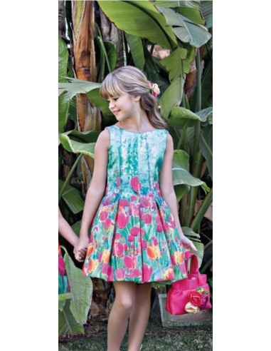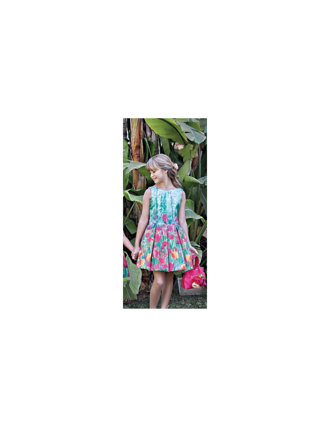 Vestido corto para niña en tonos versdosos irregulares con estampado floral, cuello en forma de U y sin mangas. Con unos pliegues en la parte de la falda.