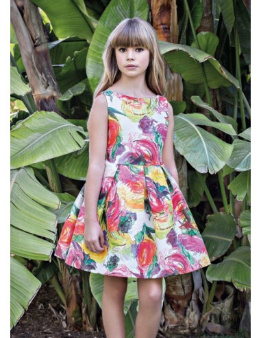 Vestido para niña corto de estampado multicolor, con el cuello redondo y sin mangas. Una explosión de colores para la princesa de la casa.