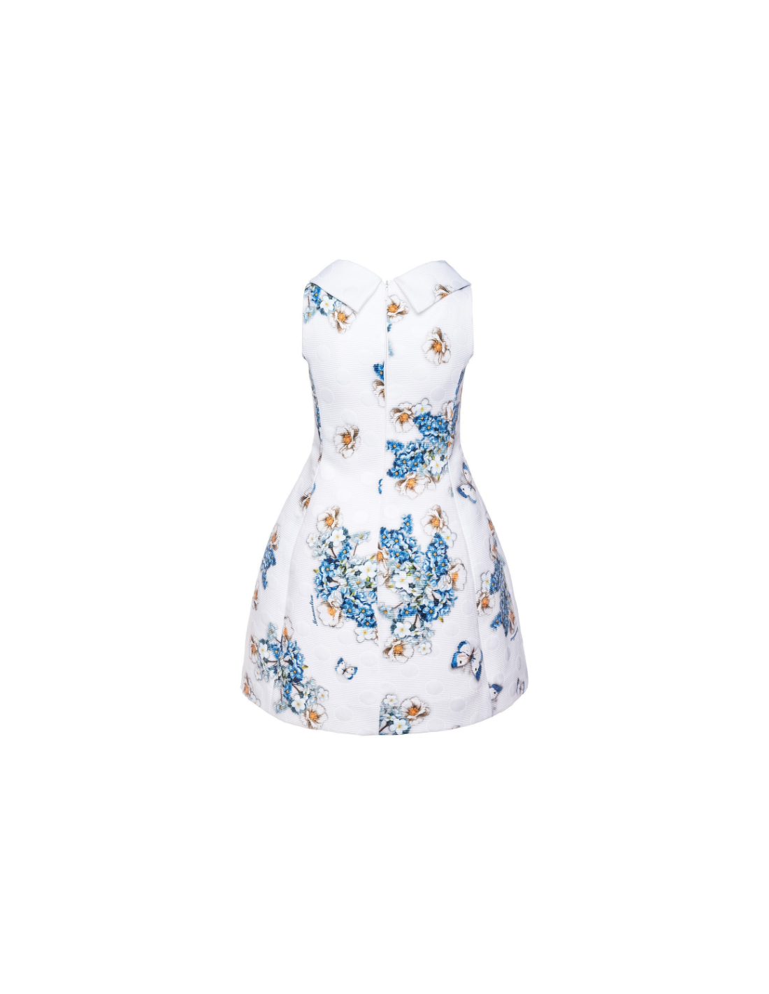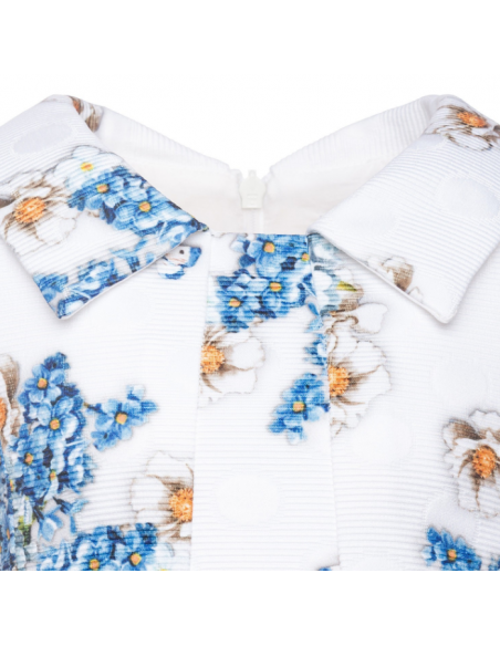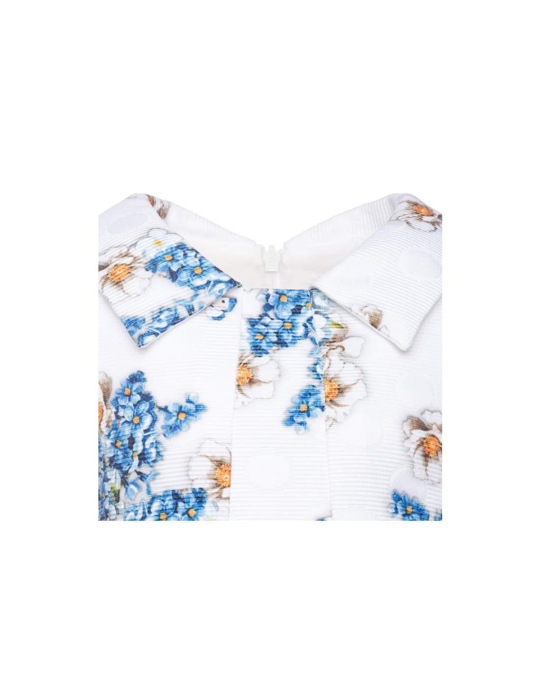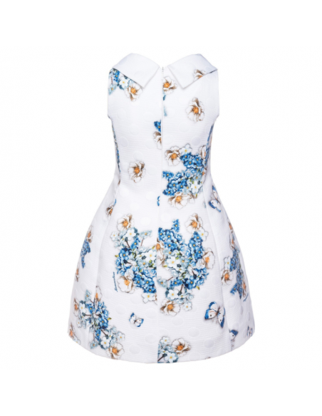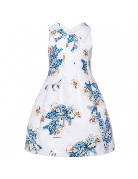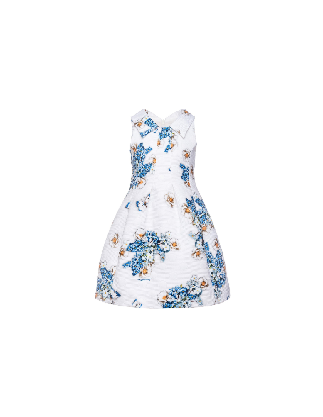 Vestido niña en otomán flores elaborado jacquard, cuello a punta, sin mangas, falda importante con pinzas, forro en algodón, cremallera por detrás