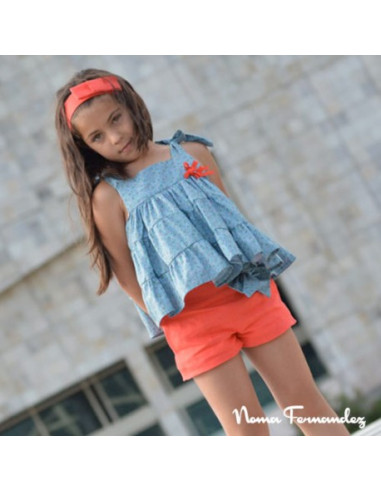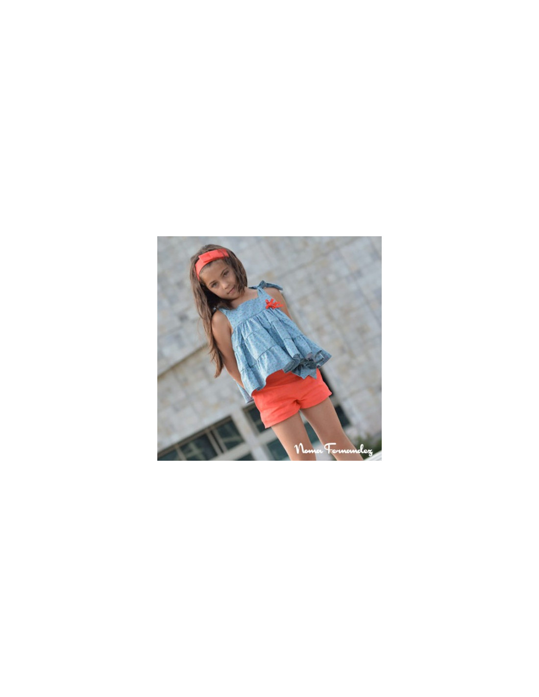 Conjunto de niña, con parte superior floral con detalle de lazo en el pecho, cuello redondo y tirantes. Short a juego con el lazo en color vivo.