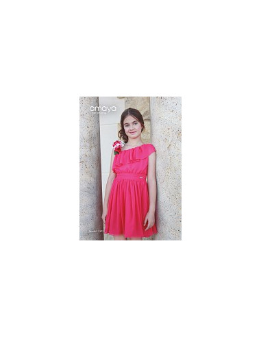 Vestido Amaya de bambula en color fucsia con adorno floral en el hombro