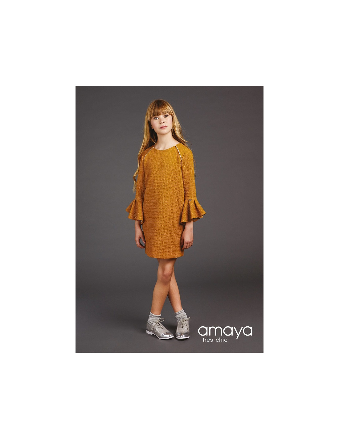 Vestido Amaya de punto en color mostaza, con volante en las mangas